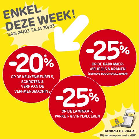 Profitez de remises exceptionnelles sur une sélection d'articles en magasin et sur brico.be. Faites vite, les stocks sont limités ! *Conditions dans la plupart des magasins.